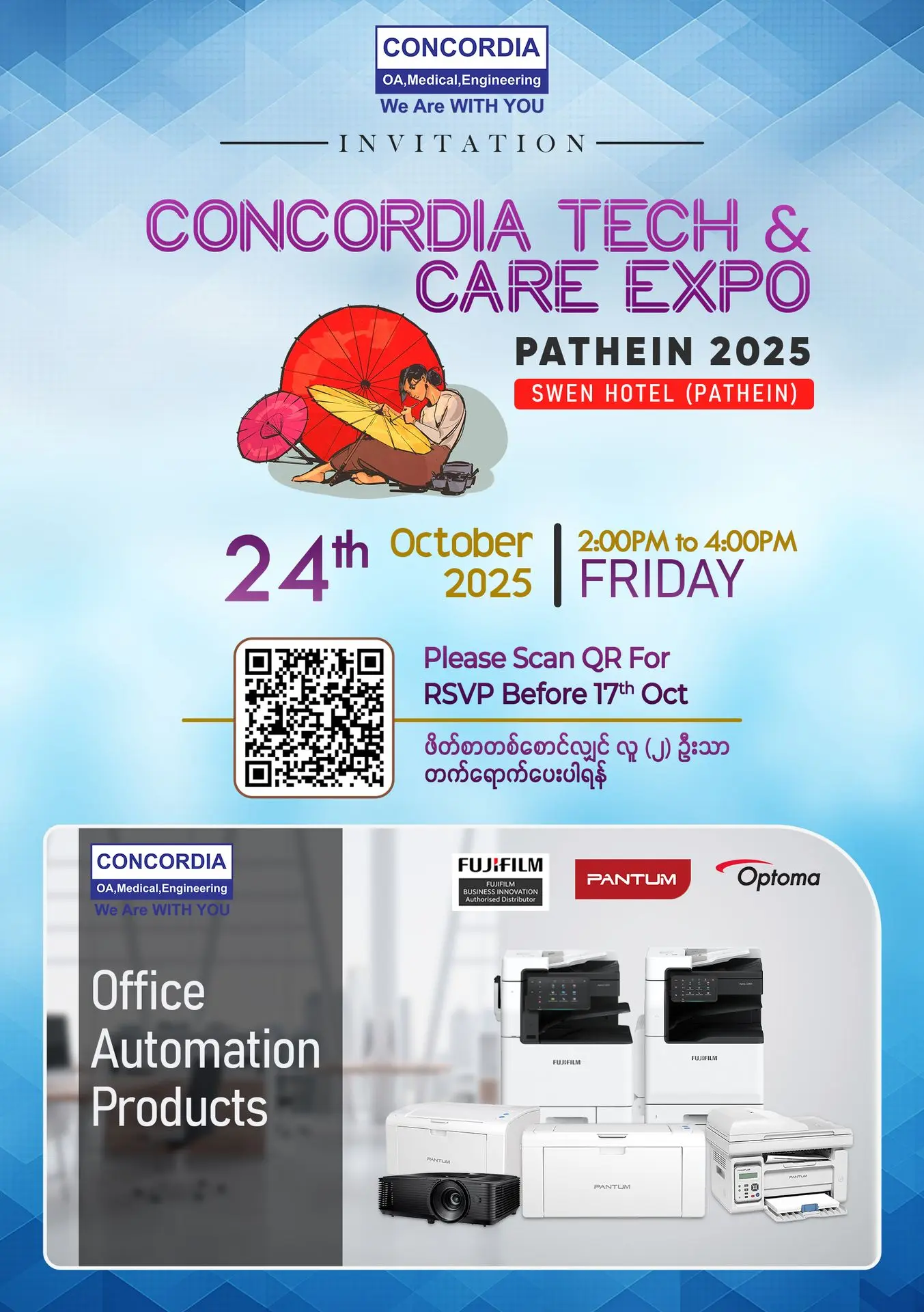 Join Concordia Public Co.,Ltd for the Concordia Tech & Care Expo Pathein 2025, featuring the latest innovations in Office Automation, Medical, and Engineering Products.